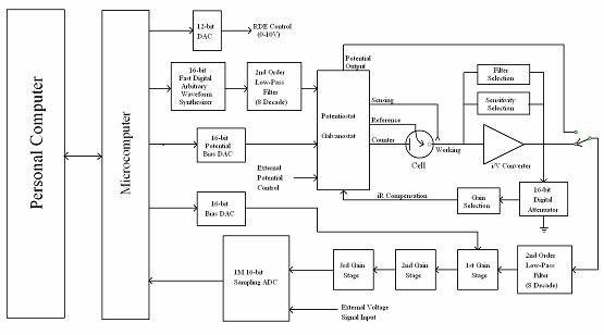 600E為通用電化學(xué)測(cè)量系統(tǒng)。下圖為儀器的硬件結(jié)構(gòu)示意圖。儀器內(nèi)含快速數(shù)字信號(hào)發(fā)生器,用于高頻交流阻抗測(cè)量的直接數(shù)字信號(hào)合成器,雙通道高速數(shù)據(jù)采集系統(tǒng),電位電流信號(hào)濾波器,多級(jí)信號(hào)增益,iR降補(bǔ)償電路,以及恒電位儀/恒電流儀(660E)。電位范圍為10V,電流范圍為250mA。電流測(cè)量下限低于10pA?芍苯佑糜诔㈦娚系姆(wěn)態(tài)電流測(cè)量。如果與 200B微電流放大器及屏蔽箱連接,可測(cè)量1pA或更低的電流。如果與