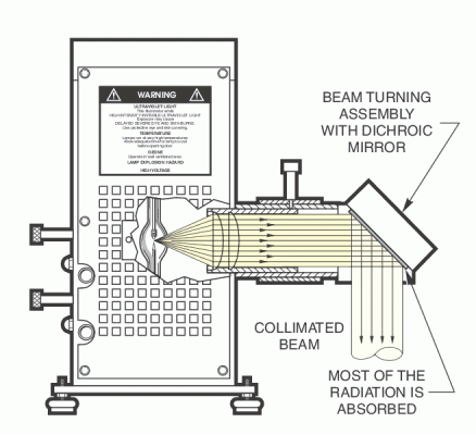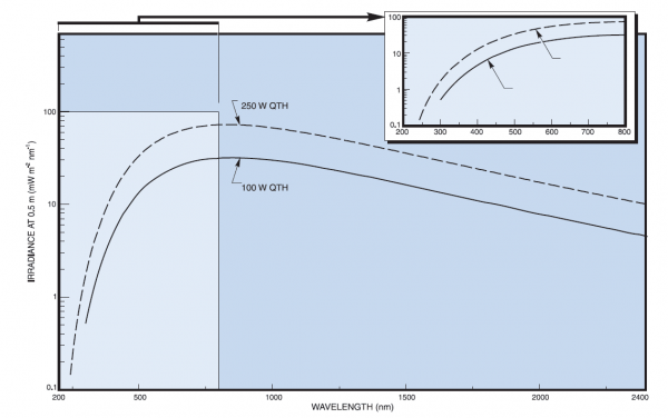 The Light Source uses different power lamps as its illumination source. This Tungsten Halogenlamp exhibit better output stability than arc lamps and do not produce strong UV light emission or toxic ozone. Their smooth spectral output curve make them useful for radiometric and photometric applications.