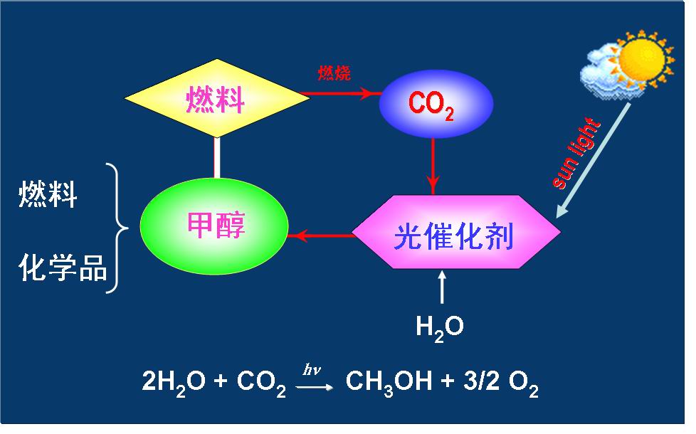 其二是原位條件下將上述兩個(gè)反應(yīng)在一個(gè)催化體系中實(shí)現(xiàn)。即,利用太陽能光催化直接將CO2+H2O轉(zhuǎn)化為CH3OH。此過程的關(guān)鍵科學(xué)問題是:(1)發(fā)展兼具有分解水制氫和CO2加氫的光催化劑;(2)將生成的氧能及時(shí)脫附離開催化劑的表面,避免氧化逆反應(yīng)地發(fā)生。